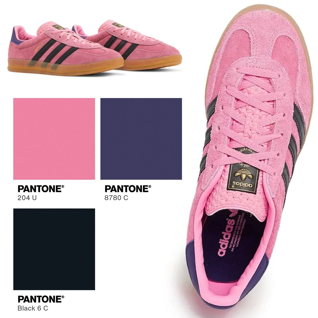 These are stunning! The soft suede of the upper is a beautiful shade of pink offset with a black 3 stripes. The heel tab is a stunning navy/purplish color. It's all sitting on a semi-translucent gum sole (the perfect touch).