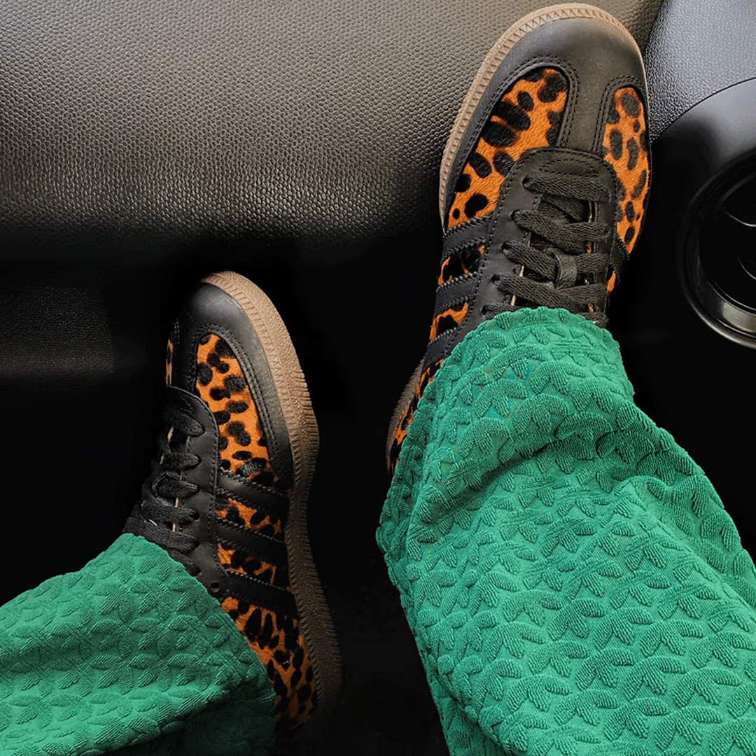 This women's-exclusive Samba mixes that iconic black leather base with bold green leopard print side panels—because subtle is so overrated. The signature T-toe and gum rubber sole keep things rooted in the OG 1950s football-inspired design, but the attitude? All modern.