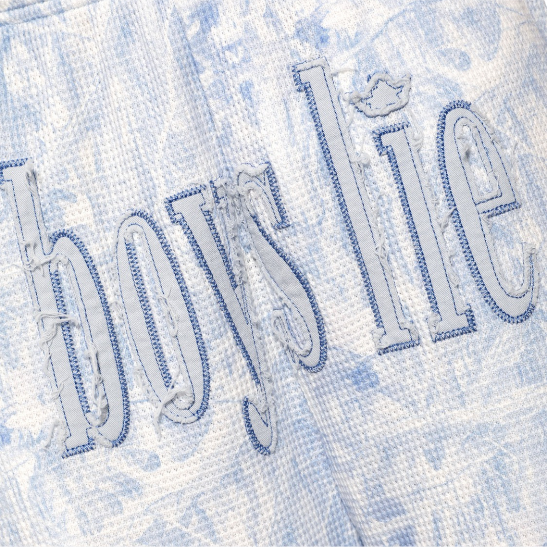 The Boys Lie Manhunt Kimmy Pant in blue is where cozy meets statement. Featuring the signature tonal allover print with oversized Boys Lie embroidery at the waistband, these joggers bring a bold edge to your loungewear lineup. Crafted from textured waffle fabric, the relaxed fit and elastic waist ensure effortless comfort without sacrificing style. Pair them with the matching Manhunt Racer Hoodie for a complete look or style with a simple crop to let the pants shine. Designed for downtime but elevated enough for streetwear styling, these pants make everyday dressing feel like a statement.