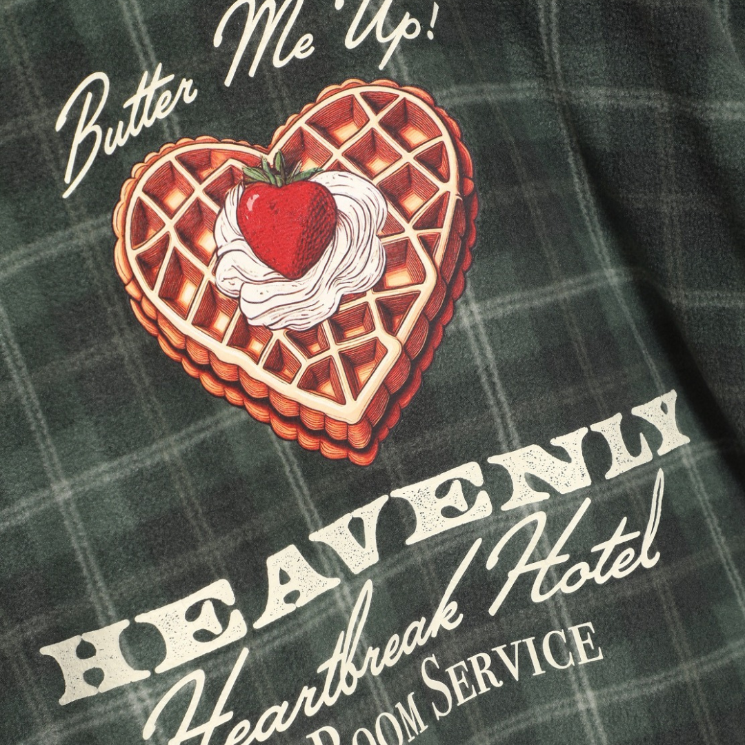 “Butter Me Up!” heart waffle and Heavenly Heartbreak Hotel graphic on back