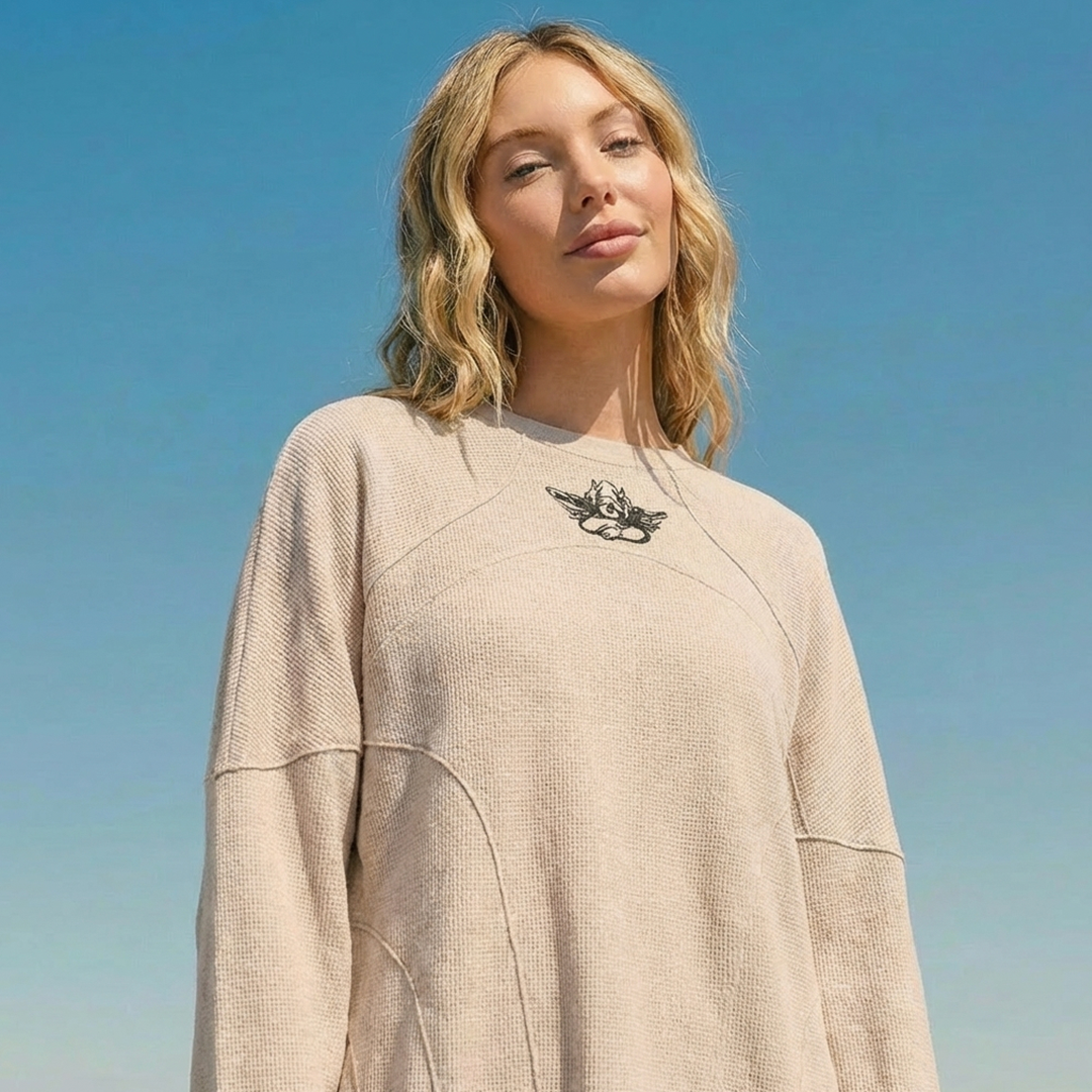 Cozy meets cool-girl edge in the Hit The Slopes Sporty Thermal LS V2. Designed with a soft, waffle-knit texture and sculpted seam detailing, this top brings effortless shape while keeping things comfy and lightweight. The standout graphic—an angelic figure with a grunge-inspired twist—adds the perfect statement moment without overpowering your fit. With its relaxed silhouette, dropped shoulders, and easy throw-on feel, this long sleeve is made for layering, lounging, and styling on repeat. Pair it with cargos, sweats, or your favorite denim for that laid-back, elevated everyday vibe.