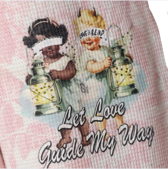 Cozy meets cosmic in the BOYS LIE Let Love Guide My Way Kimmy Pants. These soft pink waffle-knit sweatpants feature a dreamy allover print and a relaxed fit perfect for lounging, scrolling, or manifesting. The standout detail? A whimsical back graphic of two angelic girls holding lanterns with the phrase “Let Love Guide My Way” embroidered near the hip—just the right touch of sweet and sassy. With an elastic waistband and cuffed ankles, they’re cute enough to wear out but comfy enough to never leave the couch. Pair with the matching Racer Hoodie for the full vibe.