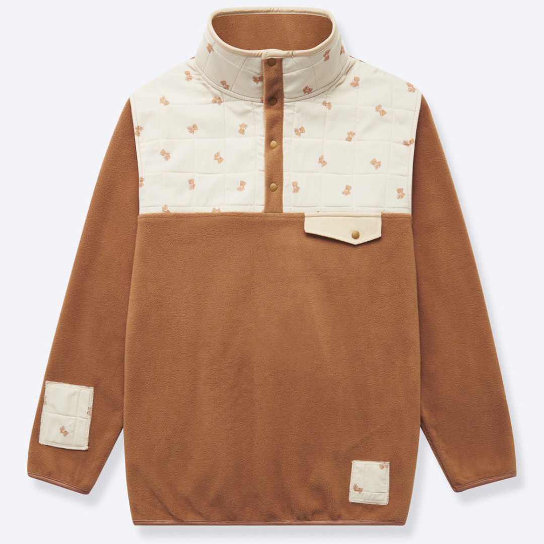 The coziest cabin-core pullover ever. This fleece features a warm brown body contrasted with quilted cream detailing stamped with mini teddy bears. The snap-front neckline, chest pocket, and cuff accents add that perfect outdoorsy-retro charm. Soft, plush, and irresistibly cute, this pullover was made for fall walks, pumpkin patches, or snuggling up at home.