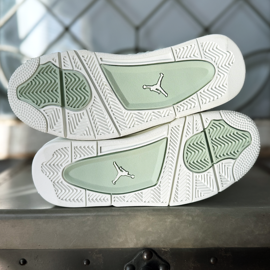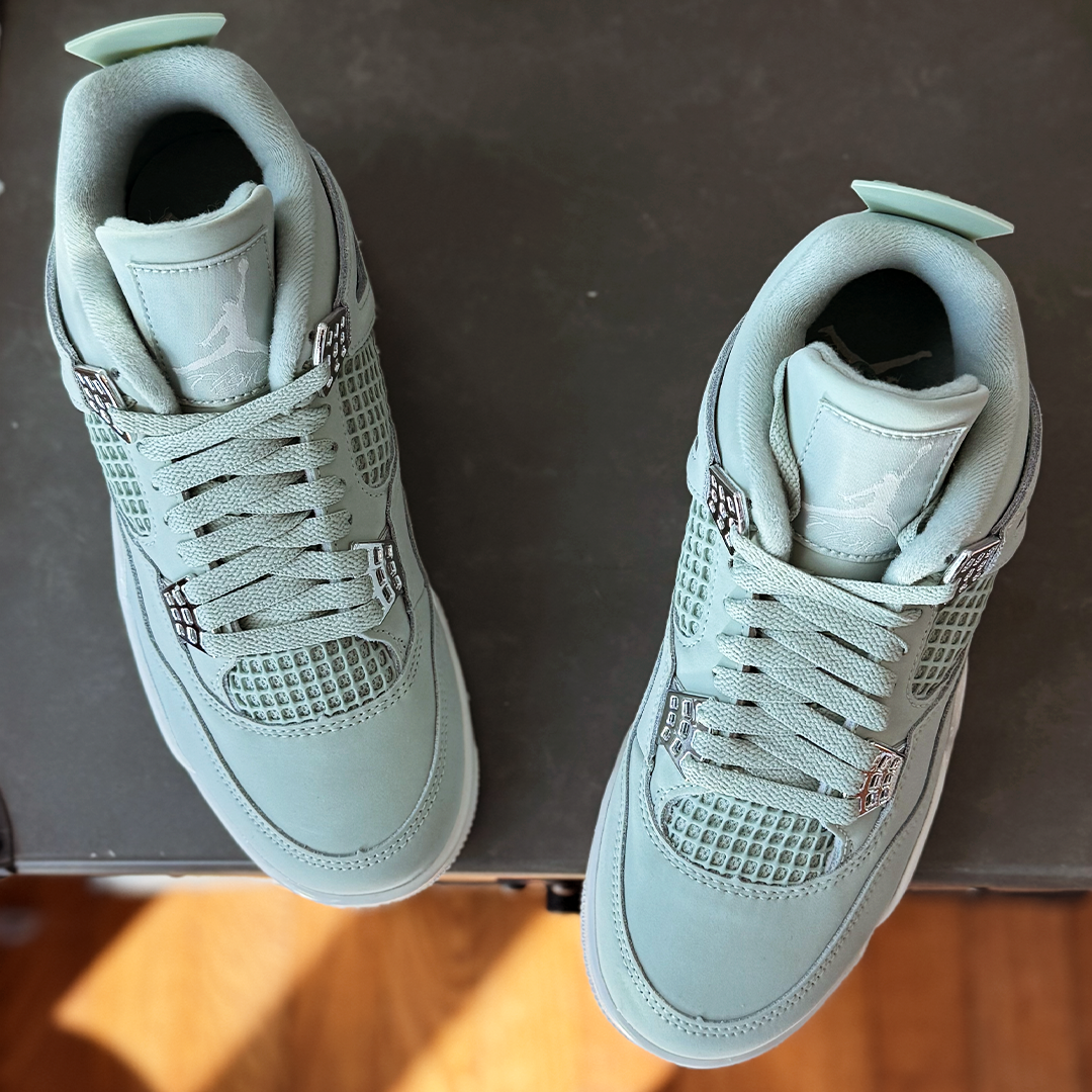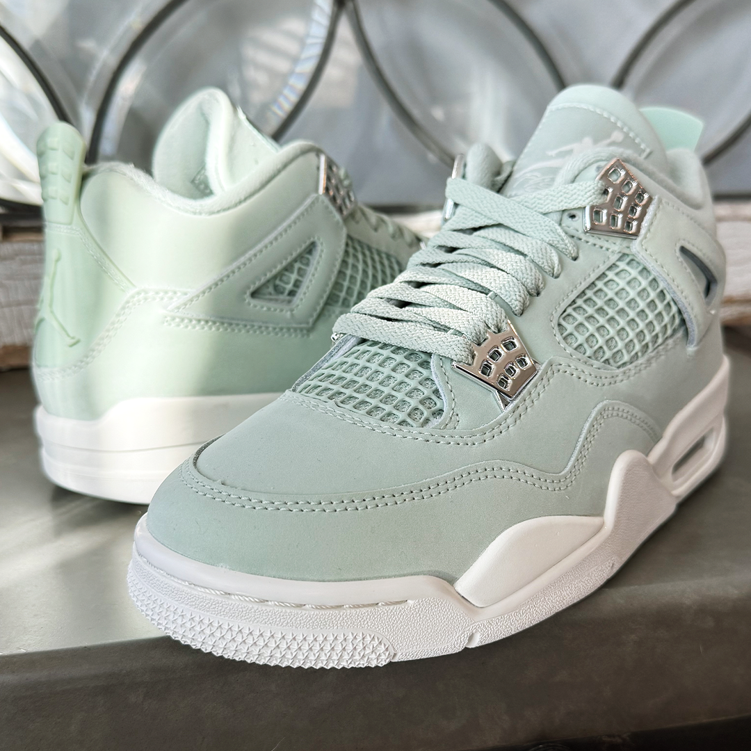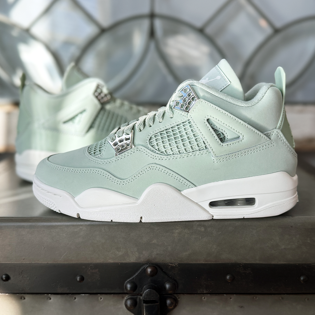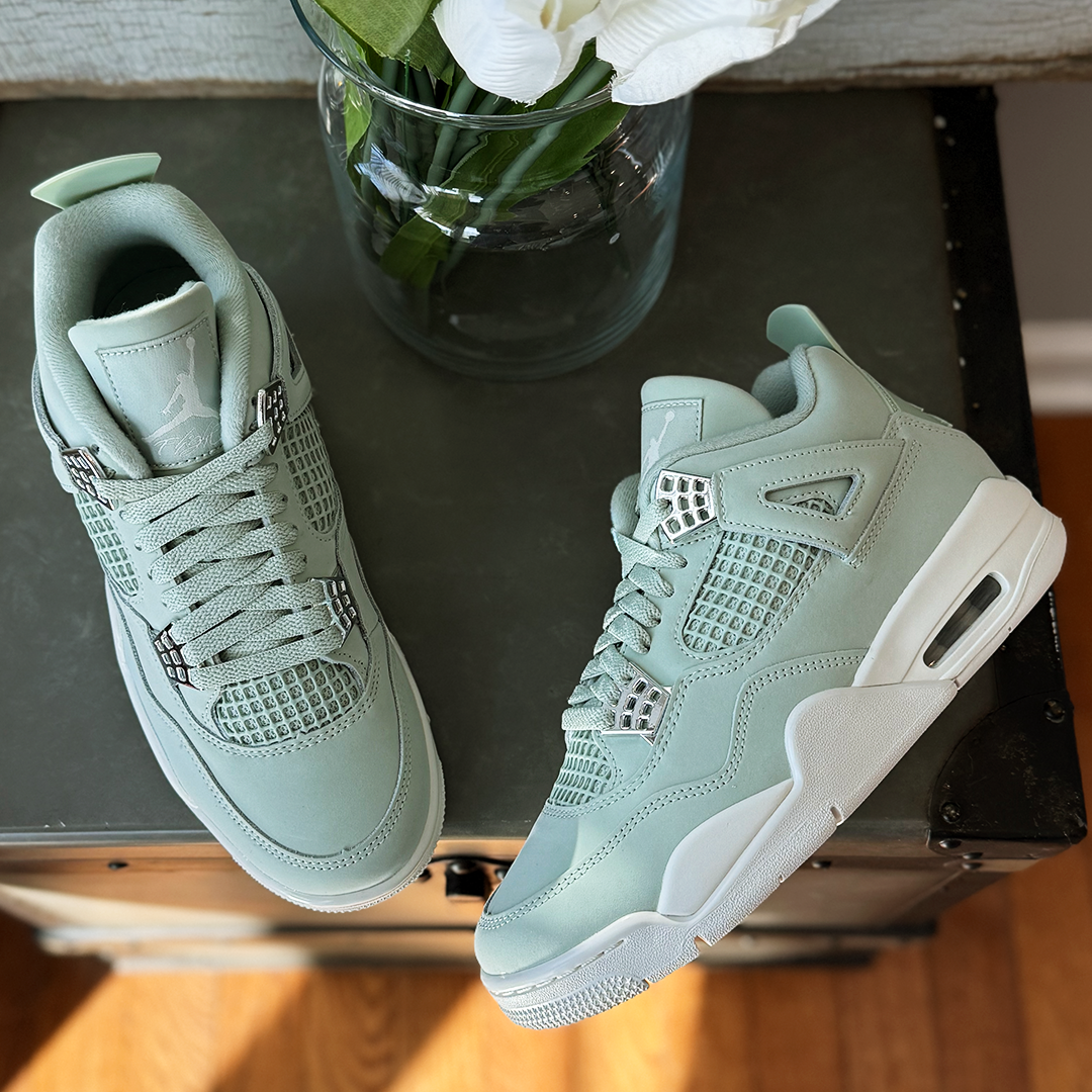 Absolutely stunning! I love this Jordan 4 in a beautiful shade of green built exclusively for women. The Jordan 4 Seafoam Sail Women's upper is a soft nubuck leather in seafoam with hits of silver metallic on the lace holders. It's all sitting the sail color midsole and sole.Â