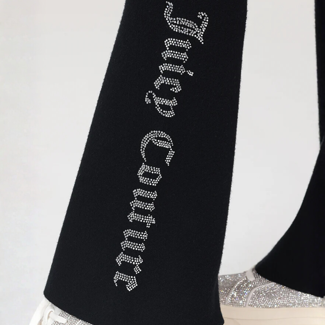 The ultimate throwback fit — redefined. The Foldover Knit Pants in Liquorice blend that iconic Juicy silhouette with a sleek, modern edge. Crafted from a soft, body-hugging knit, they feature a classic foldover waistband, subtle flare leg, and just the right amount of stretch for all-day comfort. The rich black hue keeps it timeless and versatile — pair them with the matching Big Bling Knit Hoodie for the full luxe-lounge look.