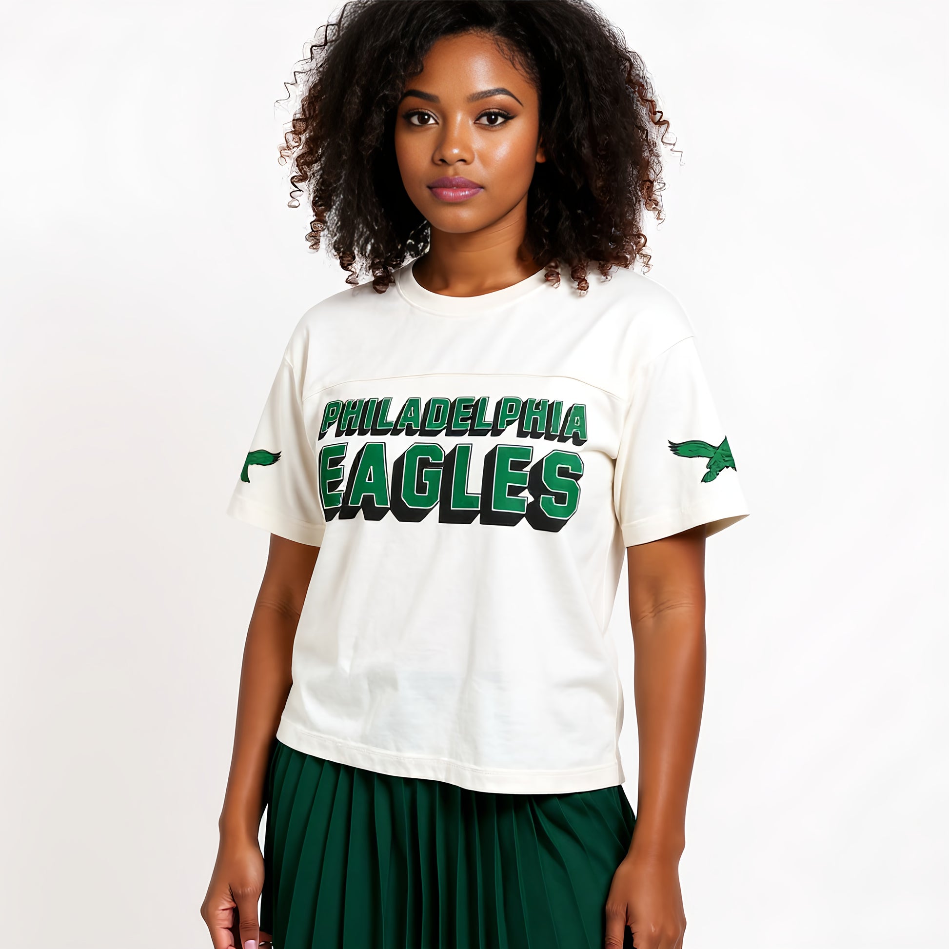 Rep your team in style with the Junk Food – Eagles Halfback Tee. This officially licensed NFL t-shirt combines vintage-inspired design with modern comfort. Featuring bold, oversized Eagles graphics across the chest and team logos on both sleeves, it’s the perfect game day statement piece. The relaxed fit and soft, breathable cotton make it ideal for layering or wearing on its own, whether you’re in the stadium, at a watch party, or out and about. Show off your team pride in a laid-back, fashion-forward way with this must-have tee for true fans.