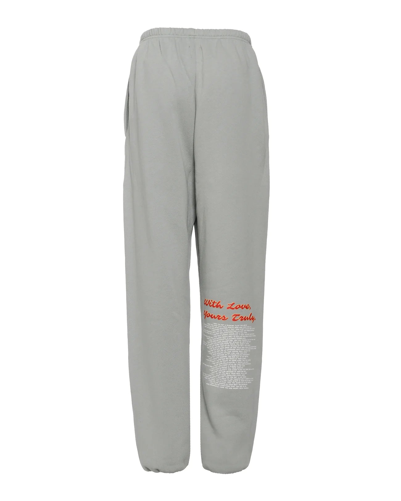 Cozy with a side of statement. The Yours Truly V2 Kimmy Pant by Boys Lie is your new off-duty favorite. These grey sweatpants keep it minimal in the front with a subtle red and yellow logo, while the back brings the drama with the signature Yours Truly graphic printed down the leg. Soft, relaxed, and made to be noticed—whether you're curled up on the couch or stepping out with sneakers and confidence.